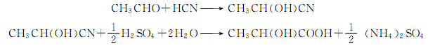 (1)乙醛法 以乙醛與氫氰酸為原料反應(yīng)生成乳腈,經(jīng)水解得粗乳酸,粗乳酸經(jīng)乙醇酯化再水解得乳酸: