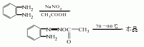 1.由鄰三胺與亞硝酸鈉反應而得。將鄰二胺加入50℃水中溶解,再加入冰醋酸,降溫至5℃,加入亞硝酸鈉攪拌反應。反應物漸漸變成暗綠色,溫度升至70-80℃,溶液變?yōu)榻奂t色,于室溫放置2h,冷卻,濾出結(jié)晶,用冰水洗滌,干燥得粗品,將粗品減壓蒸餾,收集201-204℃(2.0kpa)的餾分,再用重結(jié)晶,可得熔點為96-97℃的產(chǎn)品,產(chǎn)率80%左右。曾有報道用亞硝酸鈉處理多菌靈的縮合廢水而得副產(chǎn)物并三氮唑。